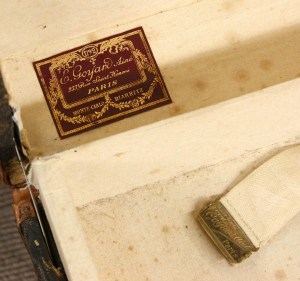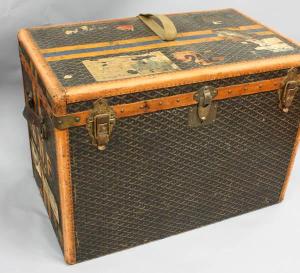 The steamer trunk itself, produced by the French luxury luggage maker, Francois Goyard, measured 22 inches high by 32 inches wide and 19 inches deep. The latches were signed “Goyard Aine, Monte Carlo, Biarritz, Paris,” and “G.N.F., S.F. No 4” was painted on the exterior.