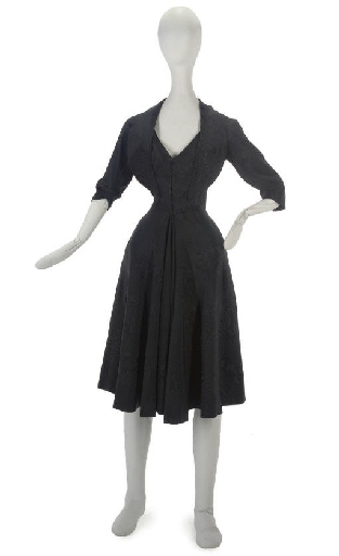 black moiré silk, with elbow length sleeves and full skirts, the bodice draped and folded to create a waistcoat-effect, labelled Grès, secondary label Santina Buenos Ayres