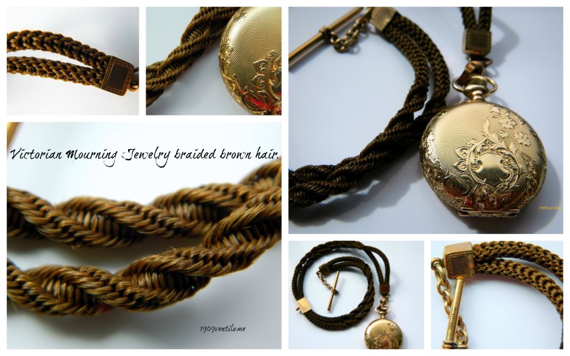 were memorial pieces – especially in the wake of the Civil War – hair work became a popular craft, also celebrating special events and happy times. Lady’s magazines printed articles on how to make useful and decorative items from hair. Watch chains, earrings, necklaces, bracelets, and brooches were popular items, as well as jewelry which incorporated the locks of a loved one. Victorian school children sometimes collected locks of hair from classmates, and put them into small binders, along with the year and name of the persons who had contributed the hair.