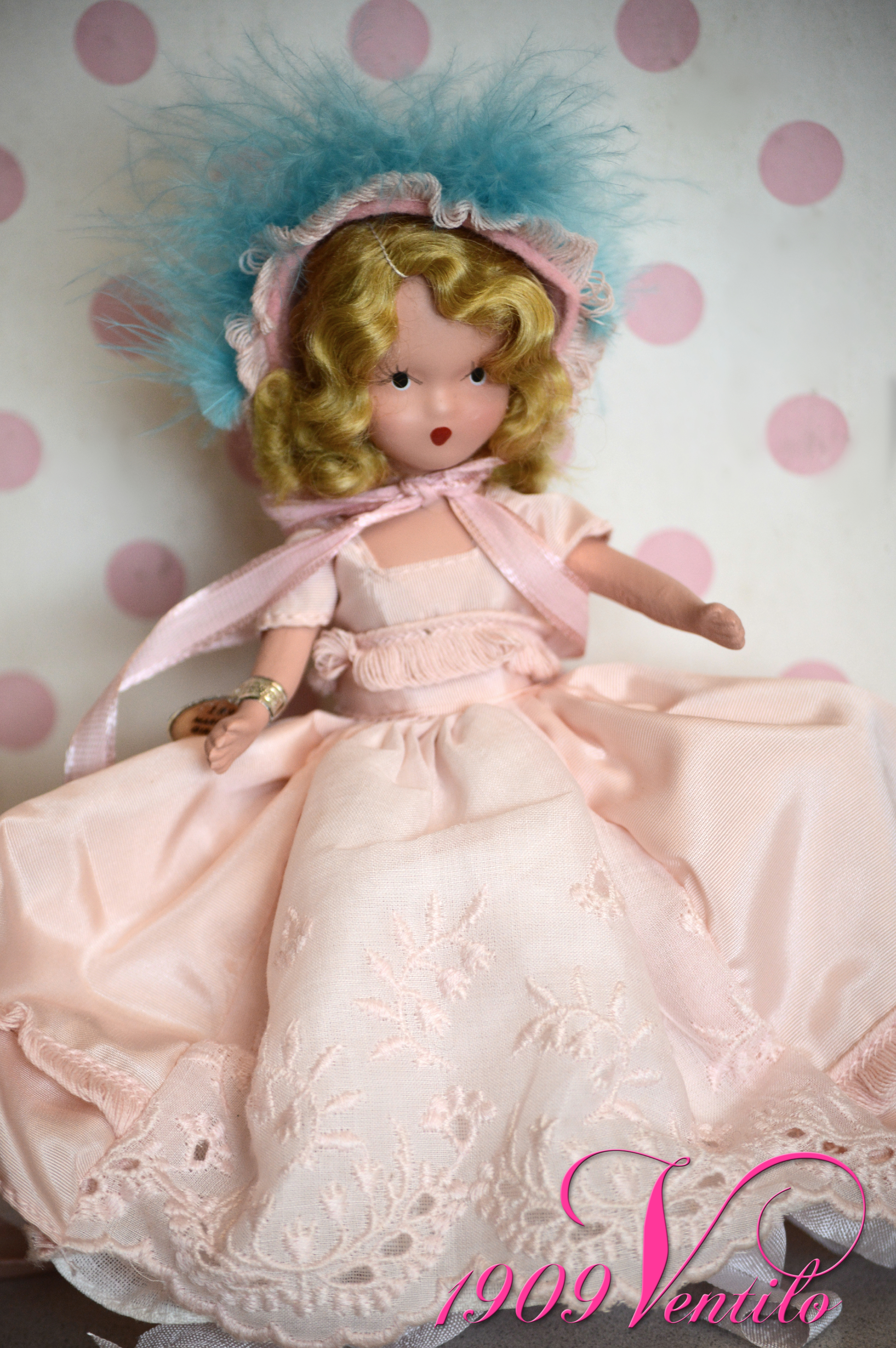 I found this Nancy Ann Doll at a sale. I usually don’t buy many dolls anymore but she caught my eye with her adorable colors! The polka dots, pink dress and the blue feathers in her hair. When I picked her up I noticed she wasn’t plastic like most of the ones I have seen. When I was young my aunt Terrie used to have some on her treasured shelf, If i asked real nice she’d get one down for me, of course I had to very careful! I read the company started in 1936 by Nancy Ann Abbot, she started with a whopping $125 dollars, working from her apartment 18 hrs a day! But by the 1950’s the company claimed a million dollar yearly gross producing 12,000 dolls per day! It appears my Nancy Ann was a fabulous buy! She has the original box, with the insert, she’s in pristine condition, she’s one of the first ones made that were hand-painted with handmade clothes, she has her original tag around her hand! She’s a March. I’m not absolutely sure but I think she maybe in the $250 range! I paid fourteen dollars. Thanks for reading my blog !! xo